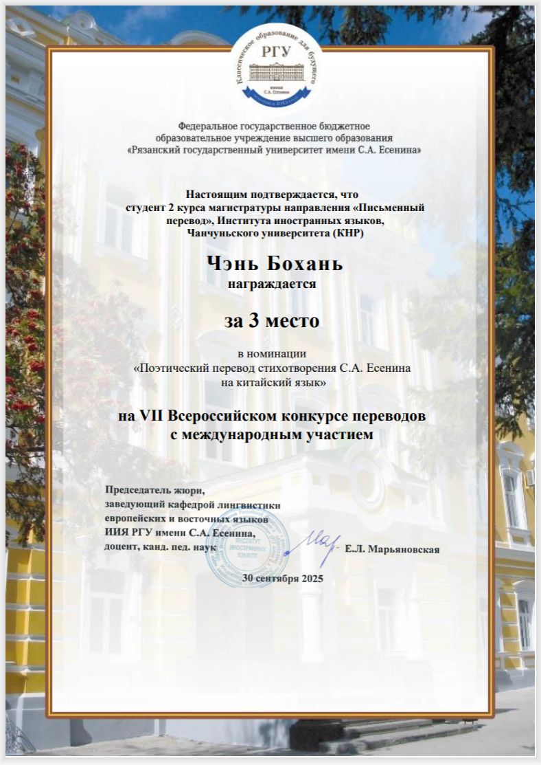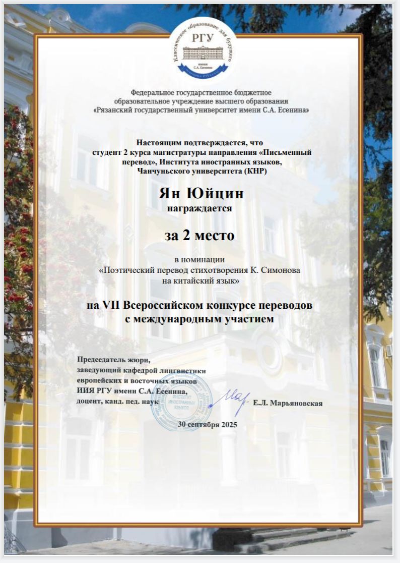 2025年8月4日至9月14日,由梁赞国立大学主办的第七届全俄翻译大赛成功举行。本届大赛面向全俄罗斯及海外高校外国语学院、语言类专业的本、专科生及硕士研究生,吸引了来自俄罗斯联邦、中国、亚美尼亚及白俄罗斯等多国学子踊跃参与。