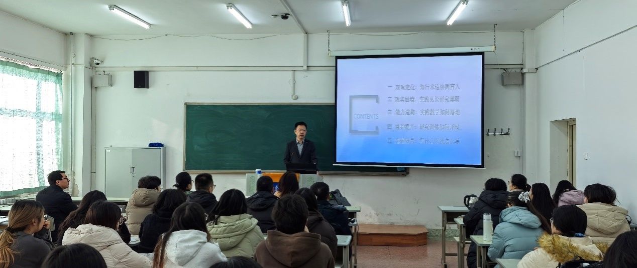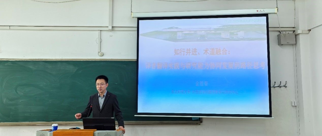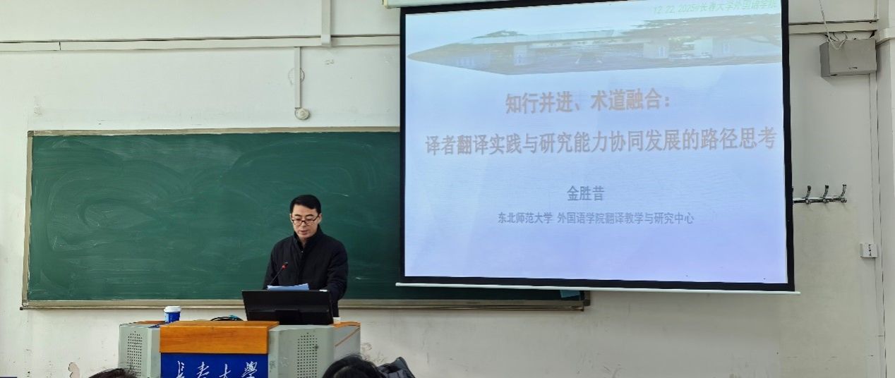 为加强教师与研究生科研能力,提升学科综合素养,持续推进翻译硕士专业学位点高质量建设,在学校科研处与研究生院的大力支持下,学院于12月22日上午在正心楼705室举办专题学术讲座。本次讲座特邀东北师范大学外国语学院翻译教学与研究中心主任、博士生导师金胜昔教授担任主讲,主题为“知行并进,术道融合——译者翻译实践与研究能力协同发展的路径思考”。讲座由学院副院长陈强主持,学院研究生导师、任课教师及2024、2025级全体研究生共同参加了讲座。